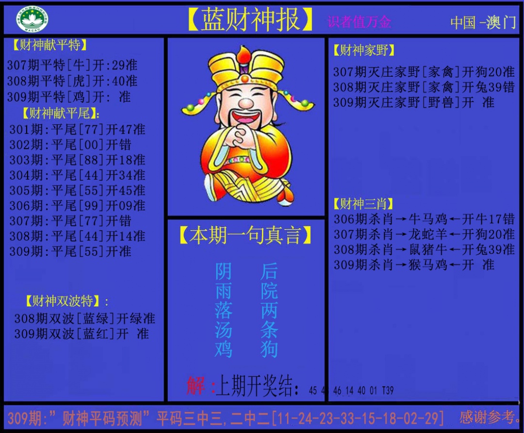 | 307期 | 鼠 | 7尾 | 06合 | 狗20 |